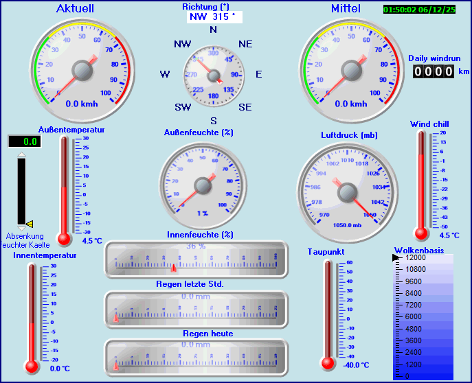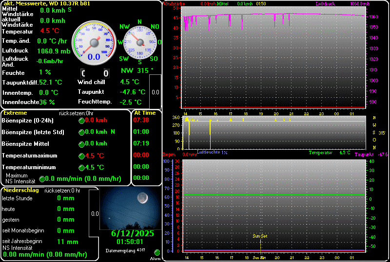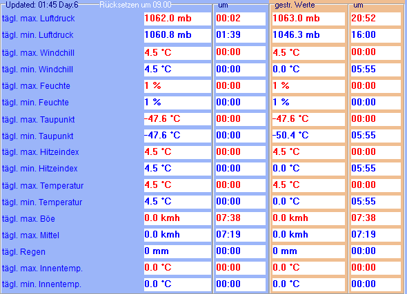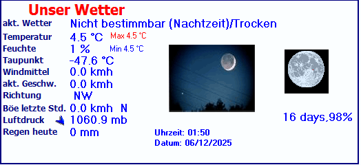 | Windchill Temperatur | 4.5°C | Windspitzen (letzte Std) | 0.0 kmh (0.0 kts) um: 01:00 |