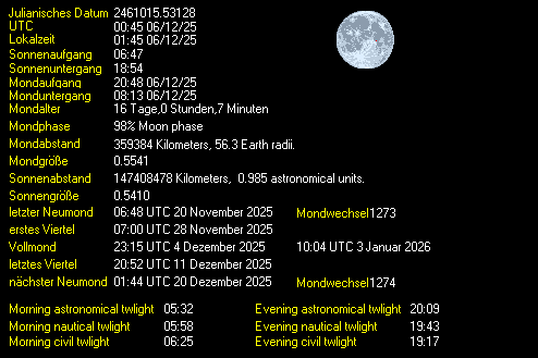 | Aktuelles Wetter | Nicht bestimmbar (Nachtzeit)/Trocken | Aktuelle Temperatur | 4.5°C (40.1°F), Apparent temp 2.0°C |