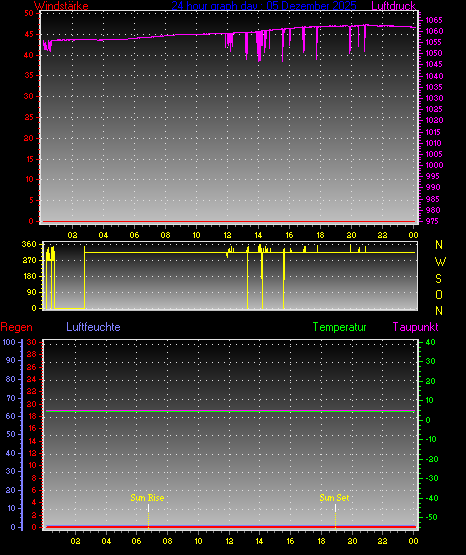 | Windspitzen (seit Mitternacht) | 0.0 kmh (0.0 kts) um: 07:38 | Höchstes Windmittel / Minute (seit Mitternacht) | 0.0 kmh (0.0 kts) um: 07:19 |